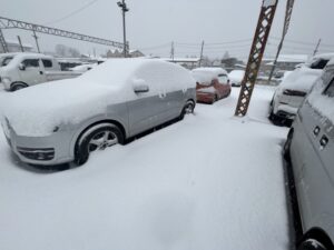 道路や停めてある車には雪が積もっております🥶